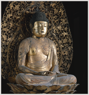 当山の本尊です。穏やかな表情を持ち、円満かつ安定した姿をしたいわゆる定朝様の半丈六坐像です。定印を結び九重の蓮華台座に坐しています。少し目を下げたところは、来迎阿弥陀の意味を含み、宝相華唐草模様の光背を持ち、荘厳な蓮華座に安坐した姿は、平安時代藤原文化の象徴ともいうべき優雅な仏像です。