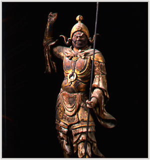 須弥壇四方に立ち、本尊を守護しています。持国天台座框の裏に記された墨書銘から建保5年(1217)造立とされています。写実的で動きのある姿態や衣の表現から、運慶らによって確立された鎌倉時代の新様式の息吹が伝わってきます。